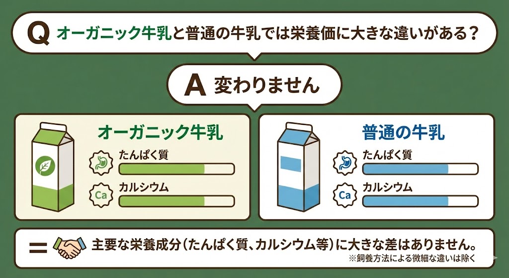 Q オーガニック牛乳と普通の牛乳では栄養価に大きな違いがある? A ありません 含まれる主要な栄養成分(たんぱく質、カルシウム等)に大きな差はありません。 栄養・成分意見のわかれ道議論ありオーガニック 参考サイト:Jミルク(2025)牛乳が分かるQ&A | findNew 牛乳乳製品の知識› 一般消費者の回答傾向 ※グラフのデータは、2025年10月~2026年2月までにYahoo!クラウドソーシングで収集した調査結果(n=12,729)に基づいています。