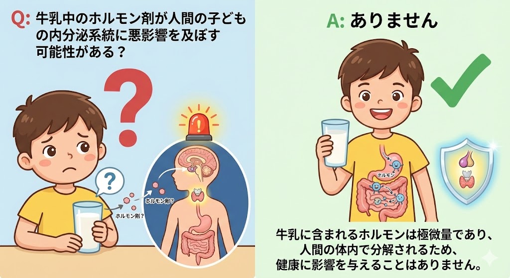 Q 牛乳中のホルモン剤が人間の子どもの内分泌系統に悪影響を及ぼす可能性がある? A ありません。 牛乳に含まれるホルモンは極微量であり、人間の体内で分解されるため、健康に影響を与えることはありません。 安全性意見のわかれ道要注意ホルモン 参考サイト:Jミルク(2025)牛乳が分かるQ&A | findNew 牛乳乳製品の知識› 一般消費者の回答傾向 ※グラフのデータは、2025年10月~2026年2月までにYahoo!クラウドソーシングで収集した調査結果(n=12,729)に基づいています。